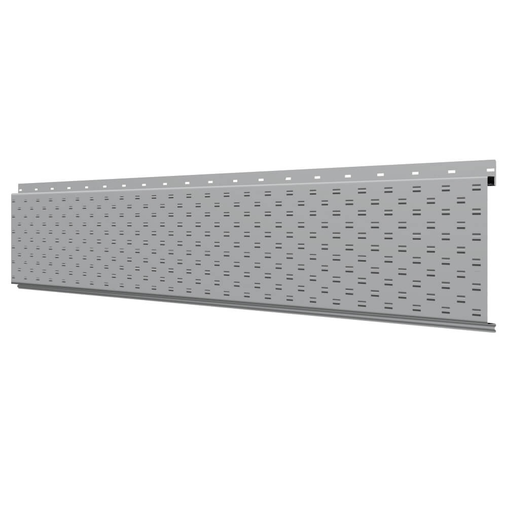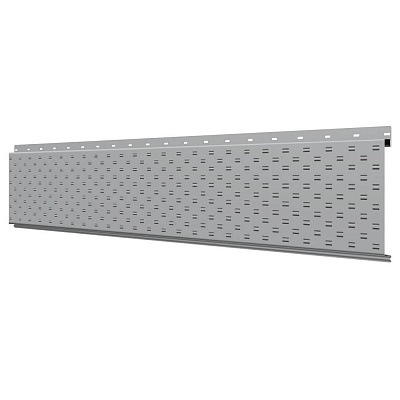 Линеарная потолочно-стеновая панель с ПЕРФОРАЦИЕЙ для вентиляции цвет RAL7004 Серый применяется в качестве софитов для подшивы крыши, наружной и внутренней отделки потолков, стен, фронтонов фасада дома в Симферополе.