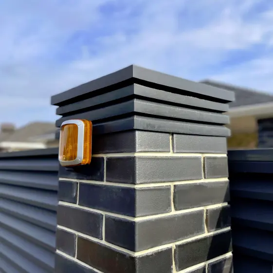 Гармоничное сочетание современных материалов и лаконичного дизайна. На кирпичных столбах установлены полимерпесчаные колпаки из коллекции Bona Хай-Тек в элегантном сером цвете, которые не только подчеркивают архитектурный стиль ограждения, но и обеспечивают надежную защиту кладки от влаги и повреждений. Парапеты Monblan аккуратно закрывают нижнюю часть забора, дополняя его единую линию. Основой ограждения служат ламели ЭКО-Z в покрытии RAL 7024 MATTE Серый Графит матовый, выполненные в двустороннем покрытии, что придаёт конструкции завершённый вид как со стороны улицы, так и со стороны двора. В результате забор получил современный, долговечный и эстетически привлекательный облик.